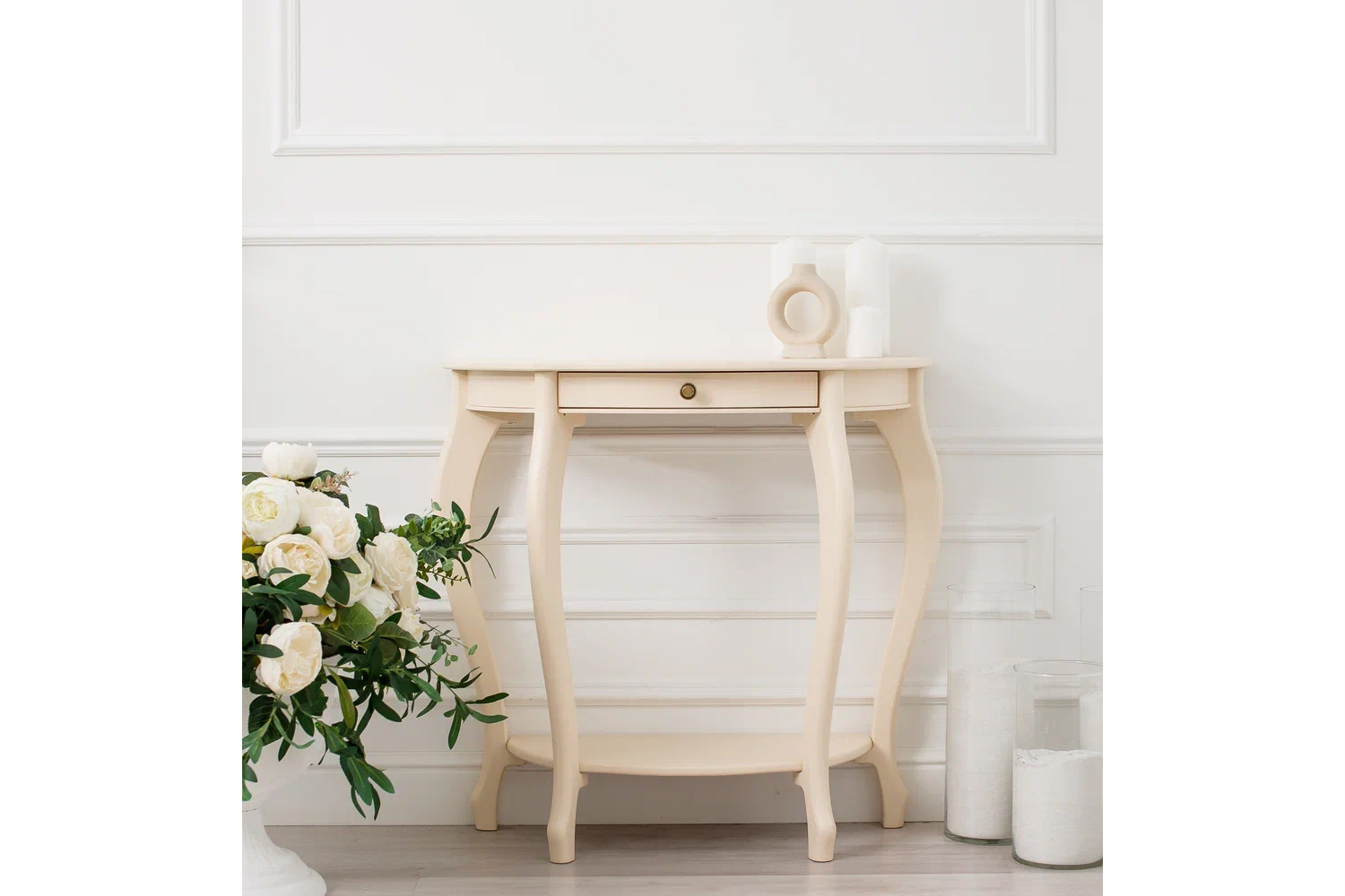 Столешница полукруглой формы выполнена из прочного, износостойкого МДФ, основание — из натуральной древесины. Лакированное глянцевое покрытие смотрится изысканно и благородно, фигурные ножки подчеркивают элегантность изделия. Широкий выдвижной ящик снабжен точечной круглой ручкой, декорированной «под золото».